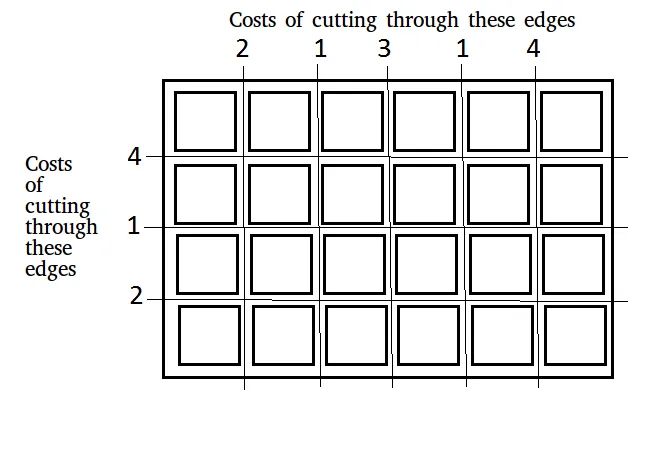 נתון לוח מידות n × מ' שצריך לחתוך ל-n × מ' ריבועים. העלות של ביצוע חיתוך לאורך קצה אופקי או אנכי מסופקת בשני מערכים: